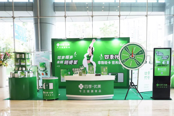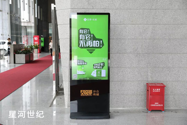 與此同時,位于深圳的高端寫字樓海王星辰大廈內也出現了一抹活力四射的四季優美綠——融入寫字樓電梯廣告元素的線下地推正向人們傳遞著四季優美的健康理念和品牌形象。